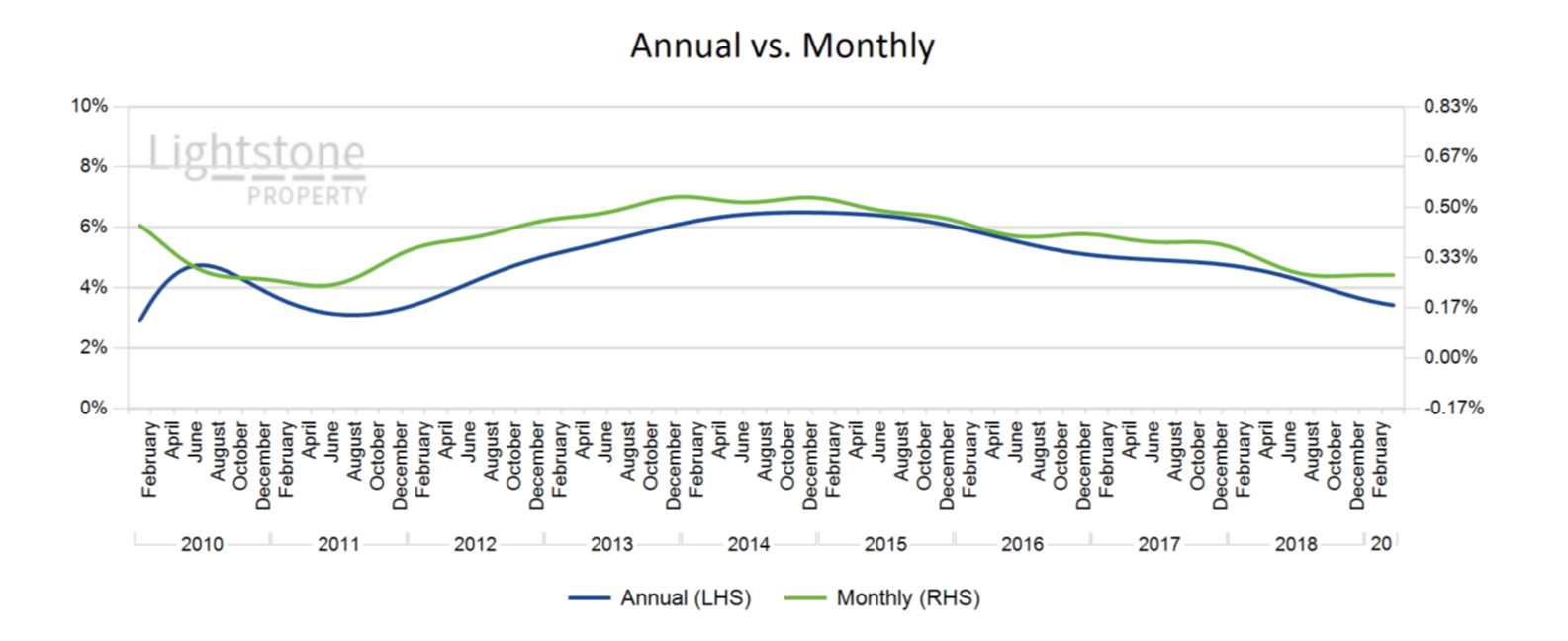 March 2020National house price inflation peaked at 6.35% per annum in 2014 during the market's recovery following the 2007-2008 crash and has been slowly decreasing thereafter closing at a five-year low of 1.7% in 2019.We expect the market to remain in consolidation with a good chance of lesser growth and activity in 2020. All