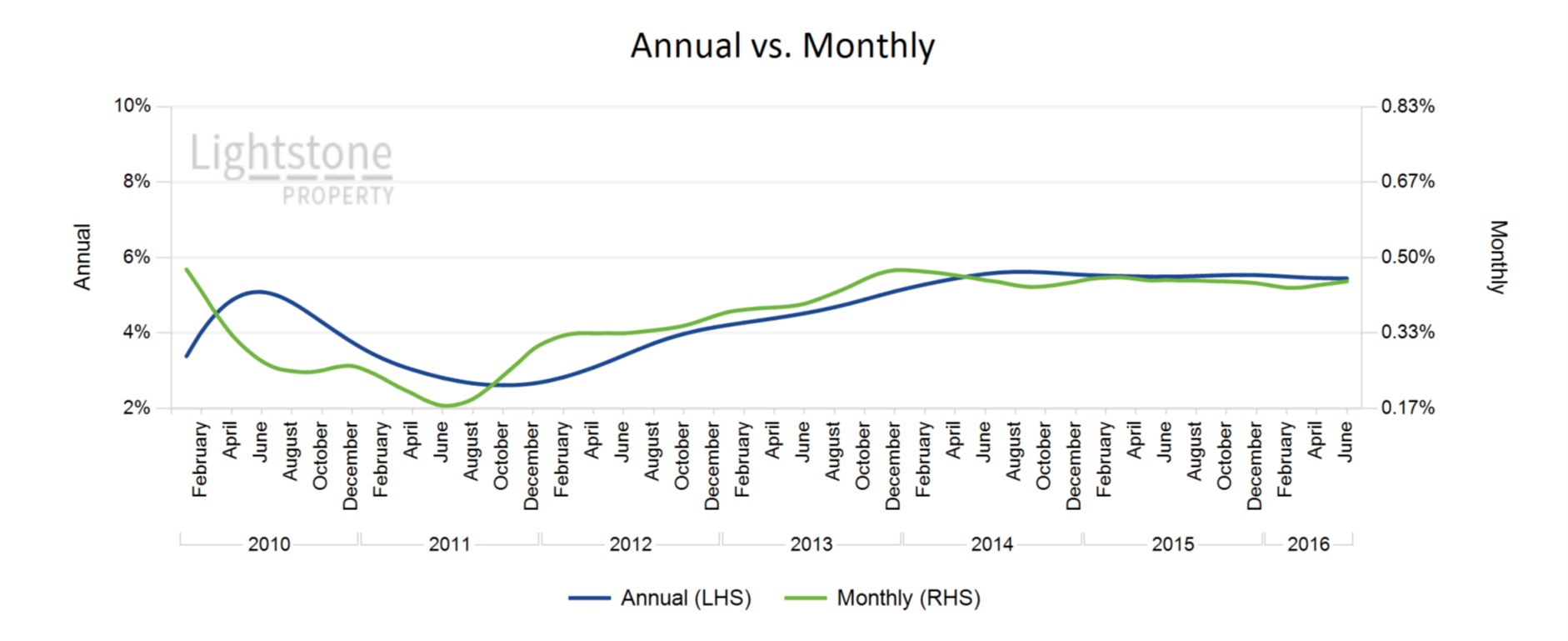 July 2016National house price inflation was 5.27% at the end of May 2016 The Low and Mid value segments continues to buck the market trend by growing by more 8% annually while the High and Luxury segments are inflating at a lower rate closer to 3% per annum. We however still observe buoyant growth in Gauteng metro with Ekurhuleni, City of Tshwane and City of Johannesburg growing at more than 6%.