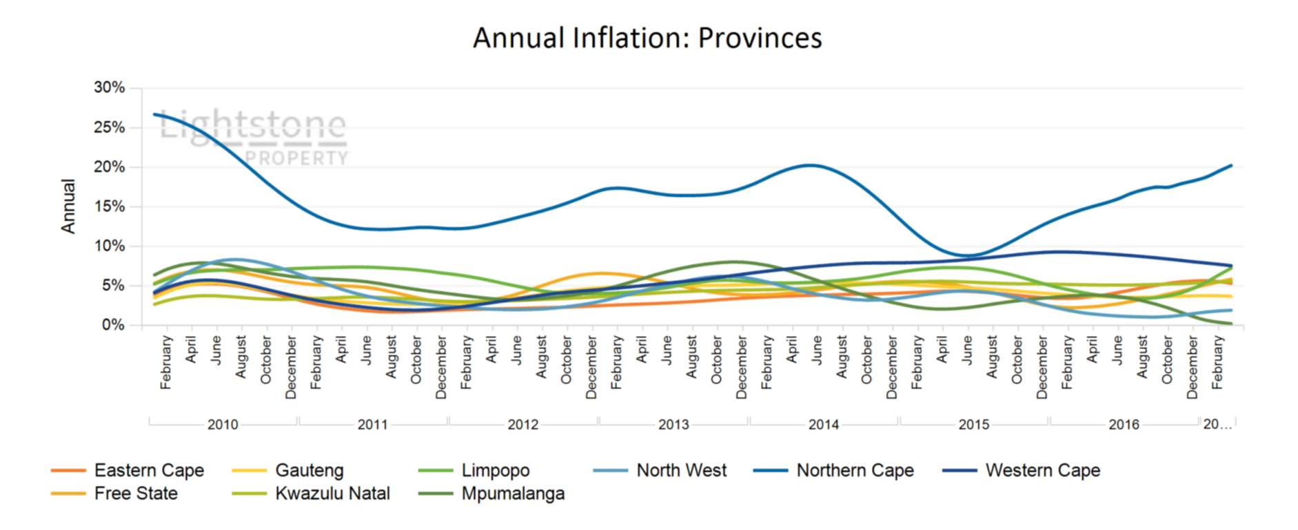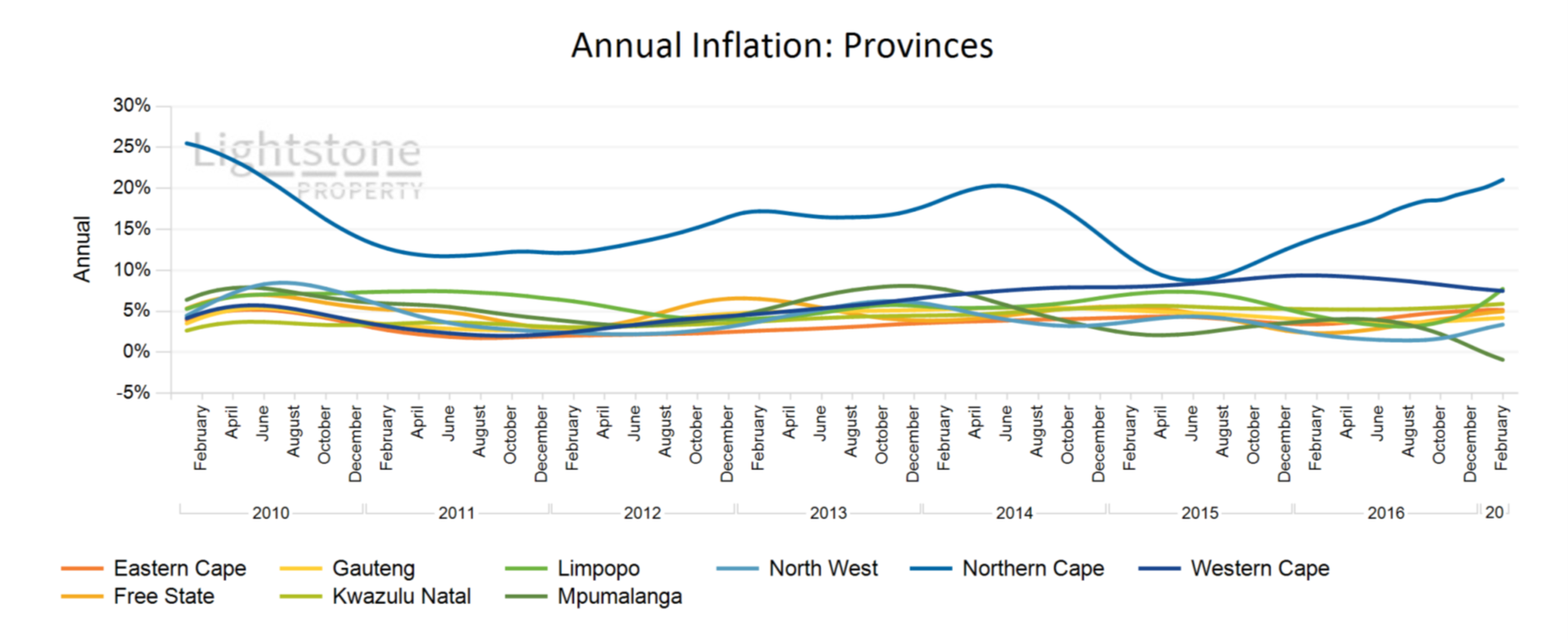 March 2017As at the end of February 2017 the national house price inflation was at 3.7%. Looking at the overall picture at provincial level it is evident the market has been slowing down over recent months. The Northern Cape, Free State and Limpopo are exceptions. Their inflation rates have been increasing gradually in 2016 with their latest being highest in the year. The Northern Cape persistently grows at an unrivalled 24.1%.