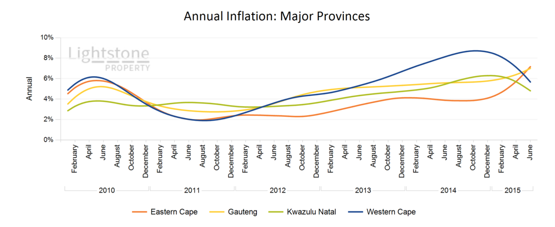 August 2016National house price inflation was 5.45% at the end of June 2016. Western Cape leads the provincial growth at a rate of 7.6%. Buoyant growth is still observed in Gauteng metro with Ekurhuleni, City of Tshwane and City of Johannesburg growing at a rate of more than 4%. While property inflation in Nelson Mandela Metro and Ethekwini continues to grow at roughly 4%, City of Cape Town continues to show exuberant growth at just above 10%. The Low and Mid value segments continue to buck the market trend by growing by more than 8% annually while the High and Luxury segments are inflating at a lower rate closer to 3% per annum.